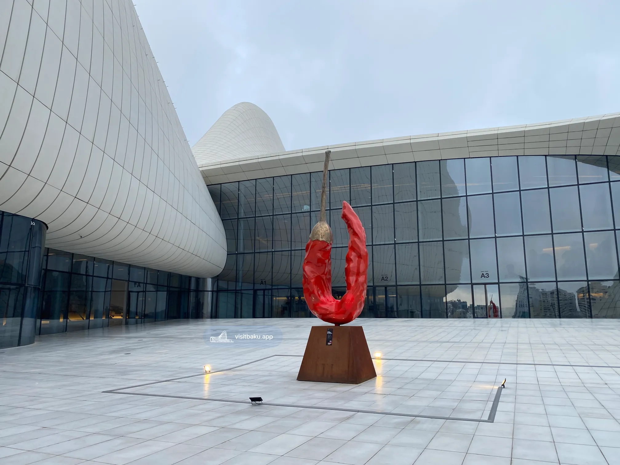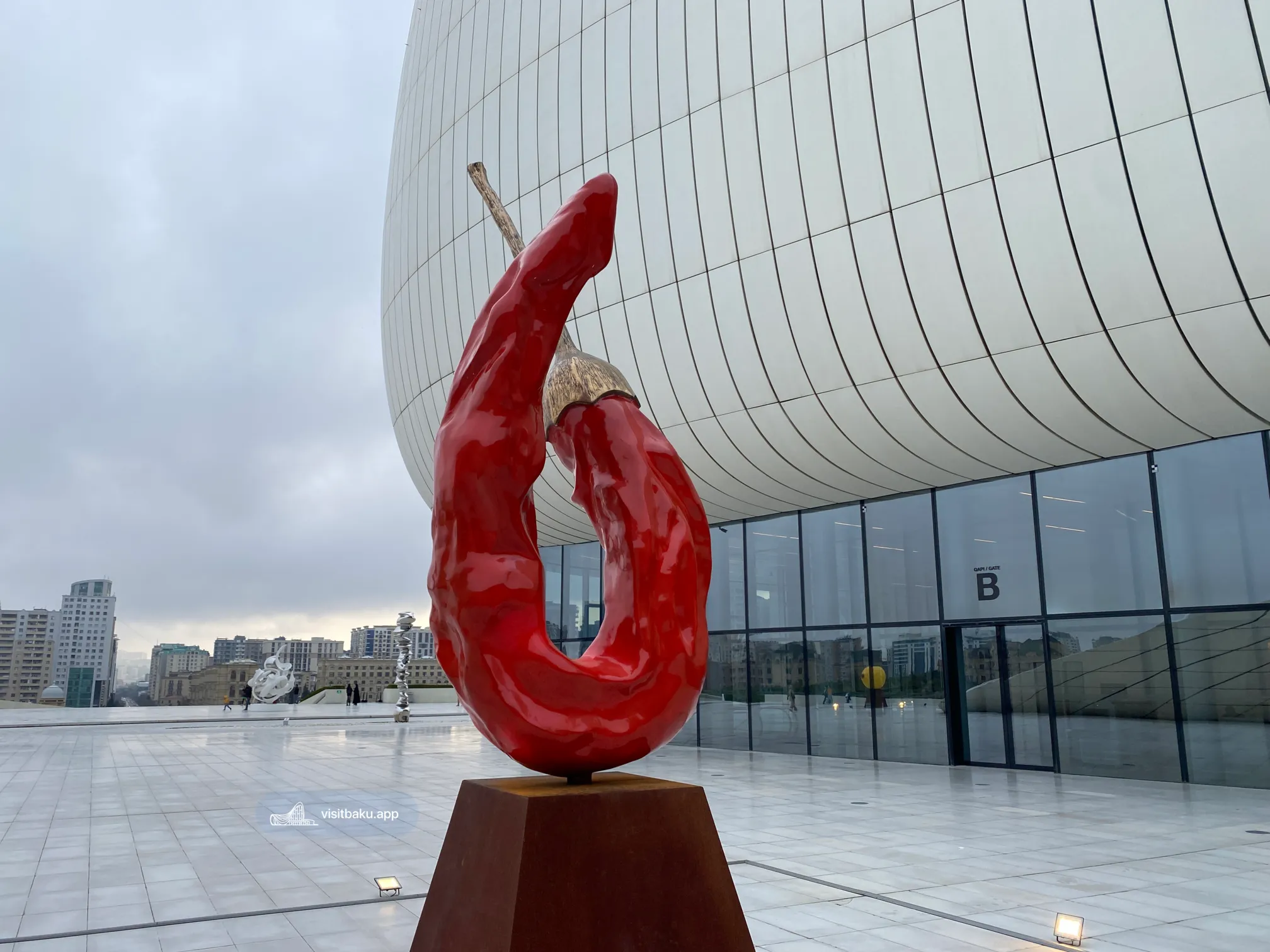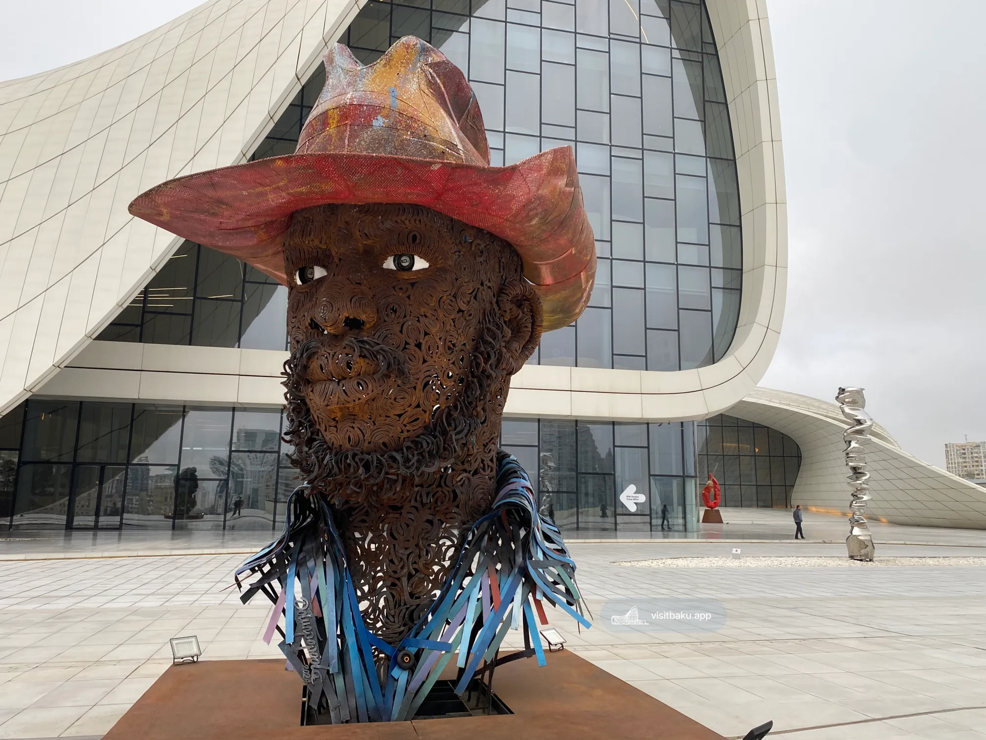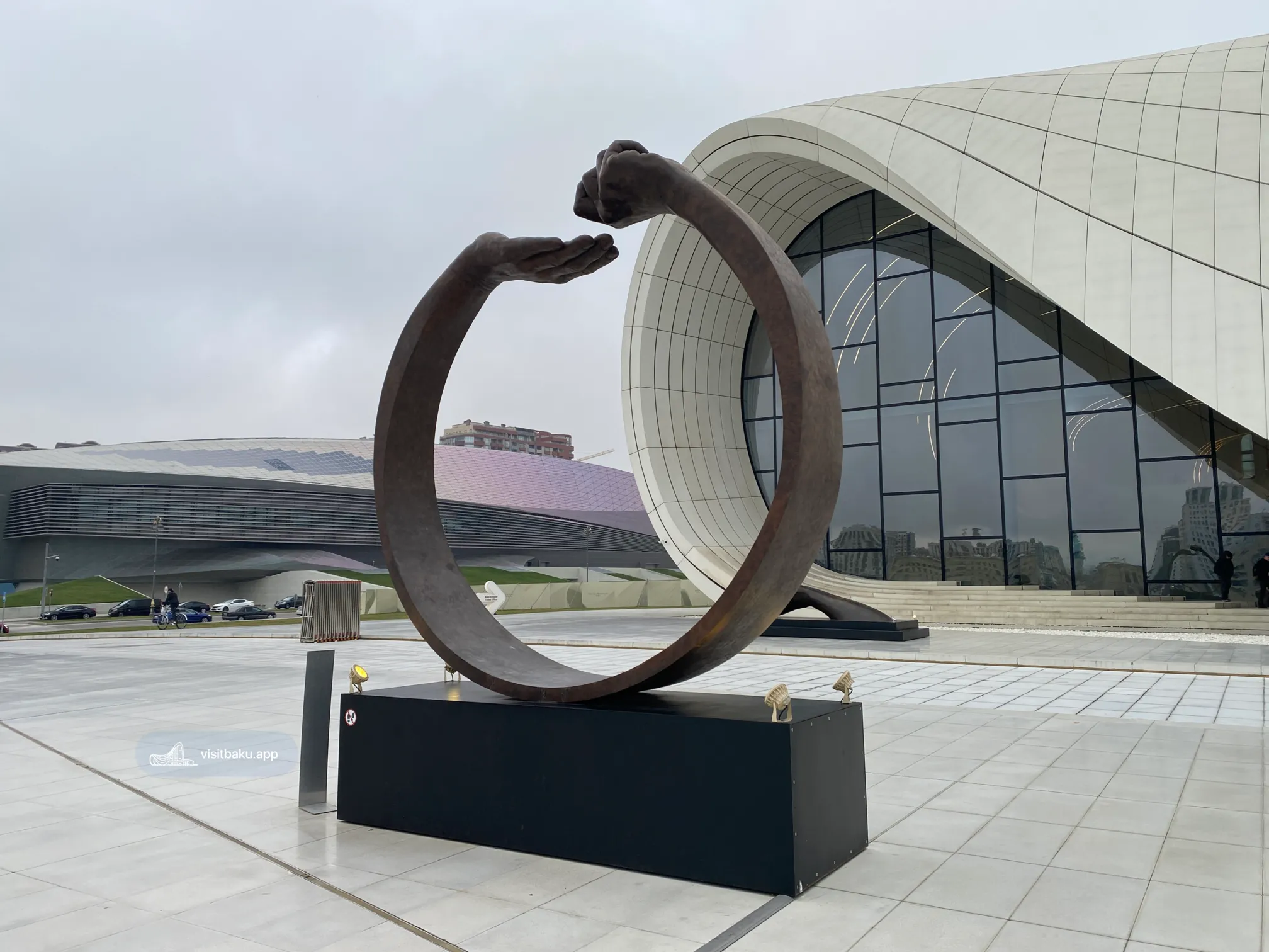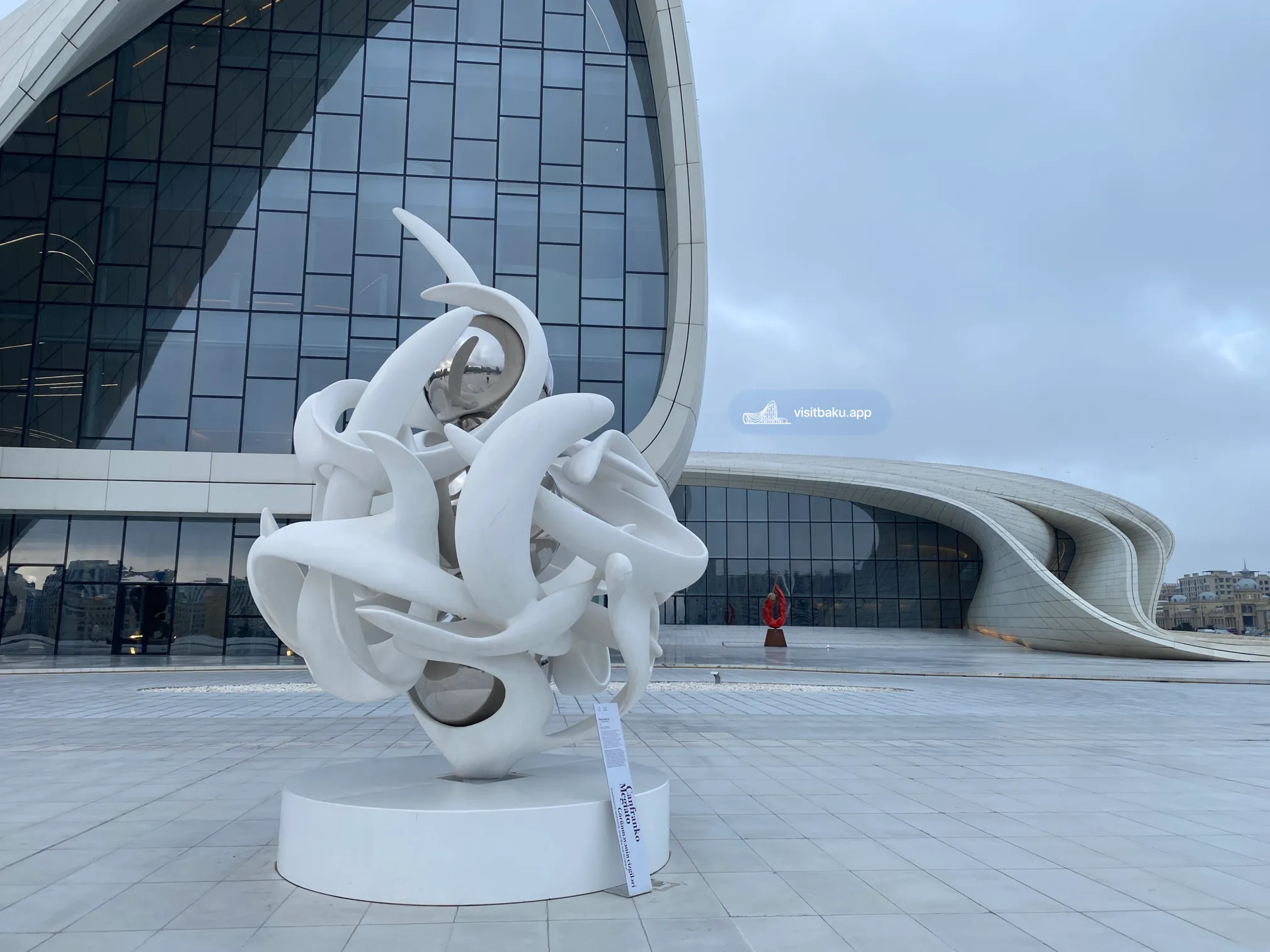But the most interesting part begins outside. Yes, right under the open sky, around the Center, there is a collection of art objects you can’t just walk past. These installations are the work of both Azerbaijani and international artists, each carrying its own mood, idea, and character. Some make you think, others make you smile, and yet others impress with their scale or irony.